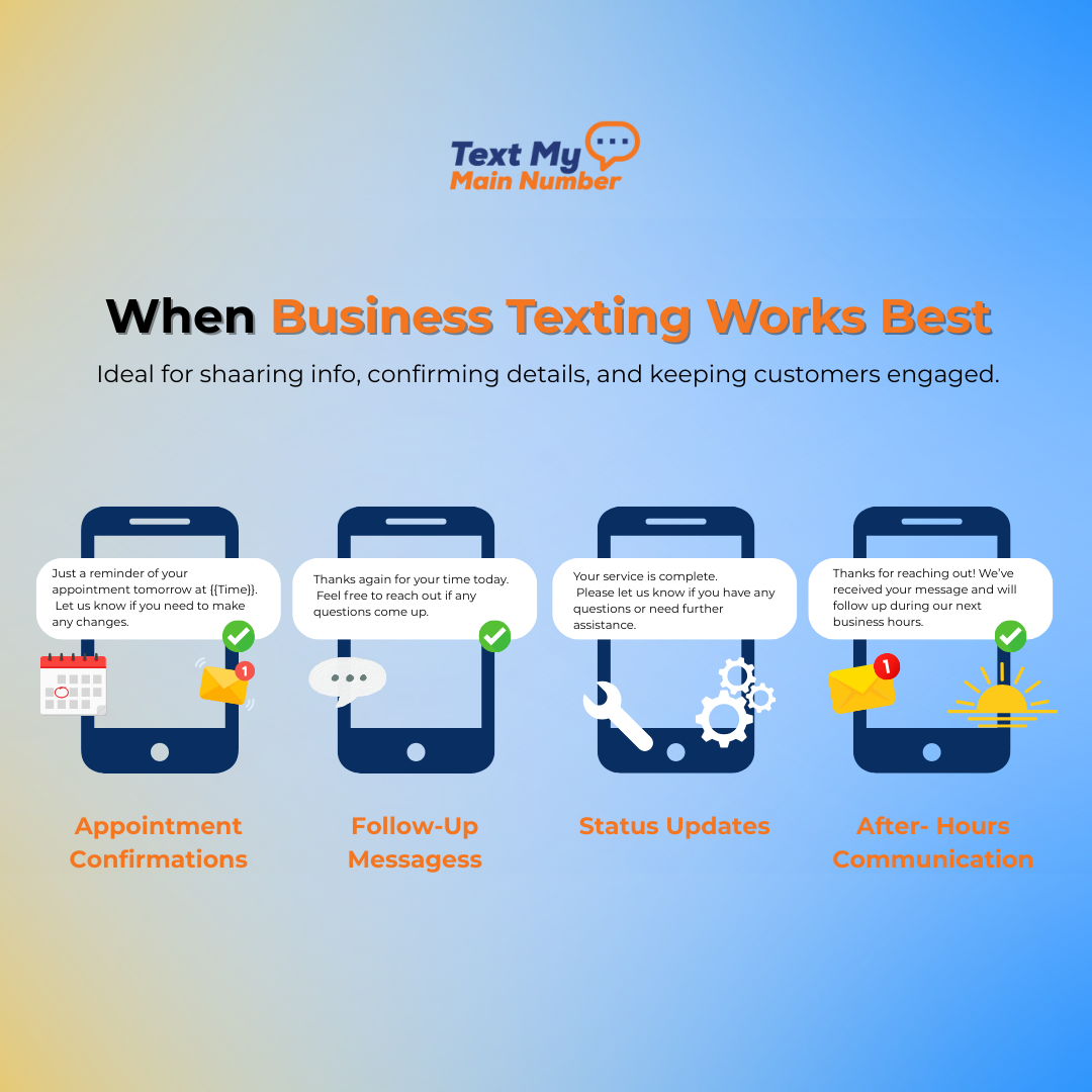 Business texting is most effective when the objective is to share information clearly, move a conversation forward, or confirm details without requiring immediate interaction. It allows businesses to stay responsive while respecting the customer’s time and attention. When used intentionally, texting reduces friction, improves response rates, and keeps communication efficient without feeling intrusive.